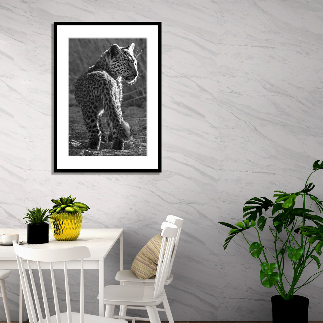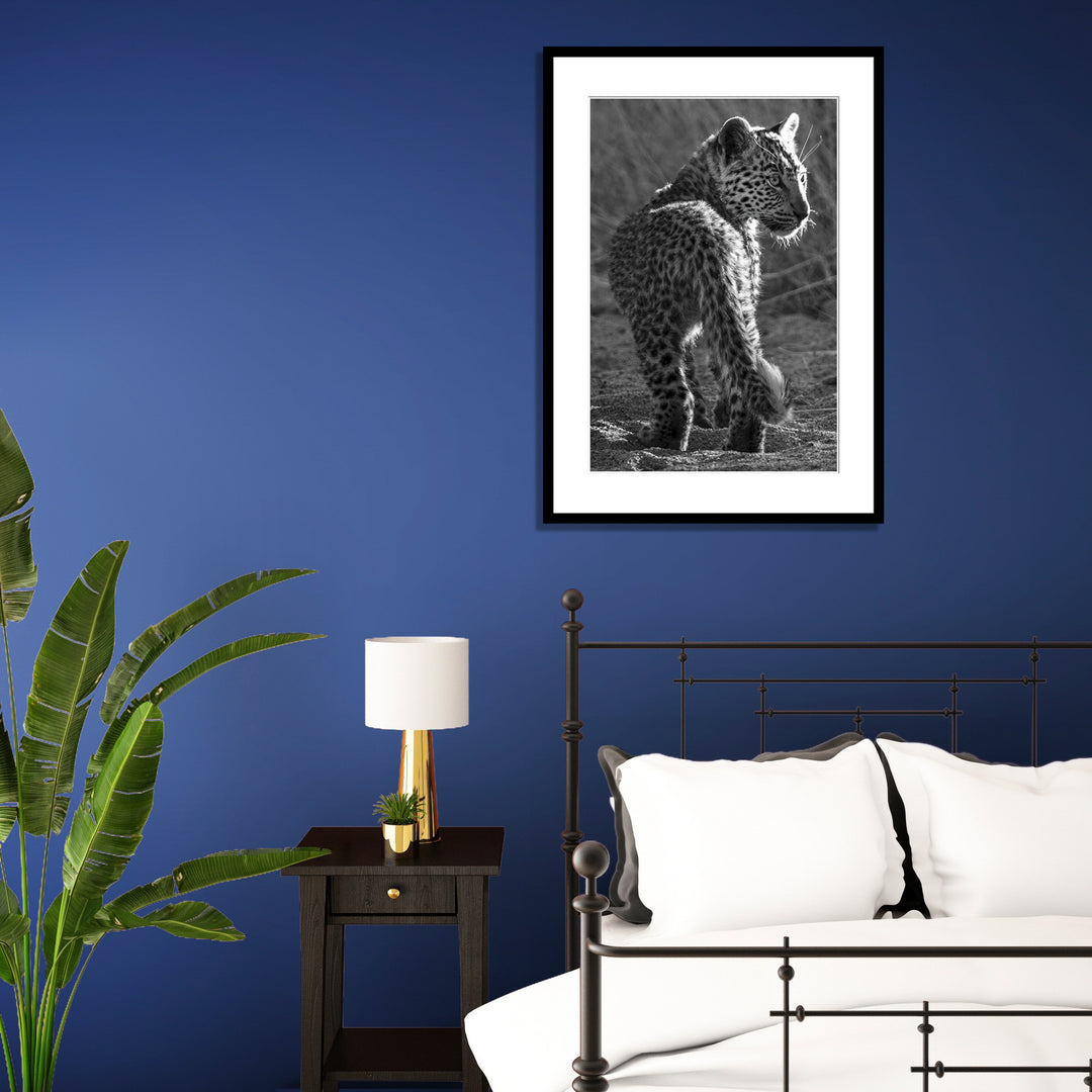This stunning black-and-white fine art wildlife photograph of an African leopard cub will draw the eye with its simplicity and beauty. Captured in the early morning light, this limited edition print brings a feeling of serenity and joy to any room. With its intriguing composition, it's sure to be a timeless addition to your collection that you’ll treasure for years to come. Owning this unique piece of art will give you the satisfaction of knowing you have something special that not many others have. This print will surely be a conversation starter and provide moments of awe when guests experience it! Enjoy Good Morning Little one today!